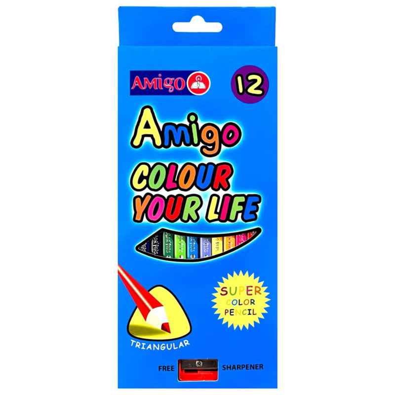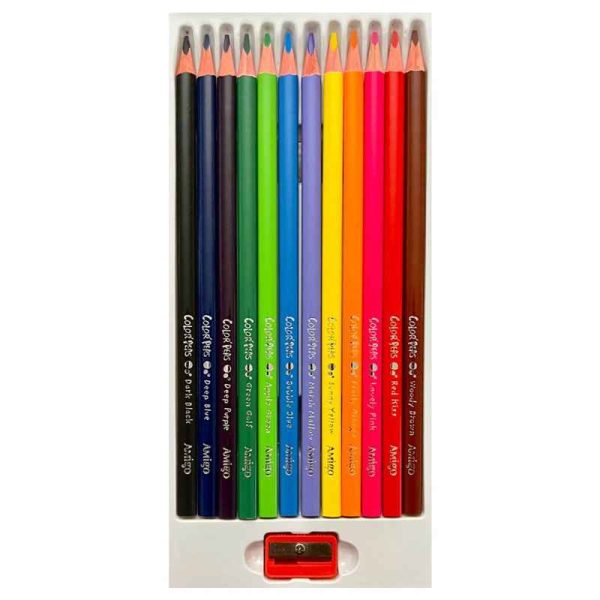 مداد رنگی 12 رنگ آمیگو Amigo ساخته شده از چوب طبیعی، بسیار با کیفیت دارای بسته بندی مقوایی، دارای 12 عدد مداد رنگی با کیفیت + یک عدد تراش